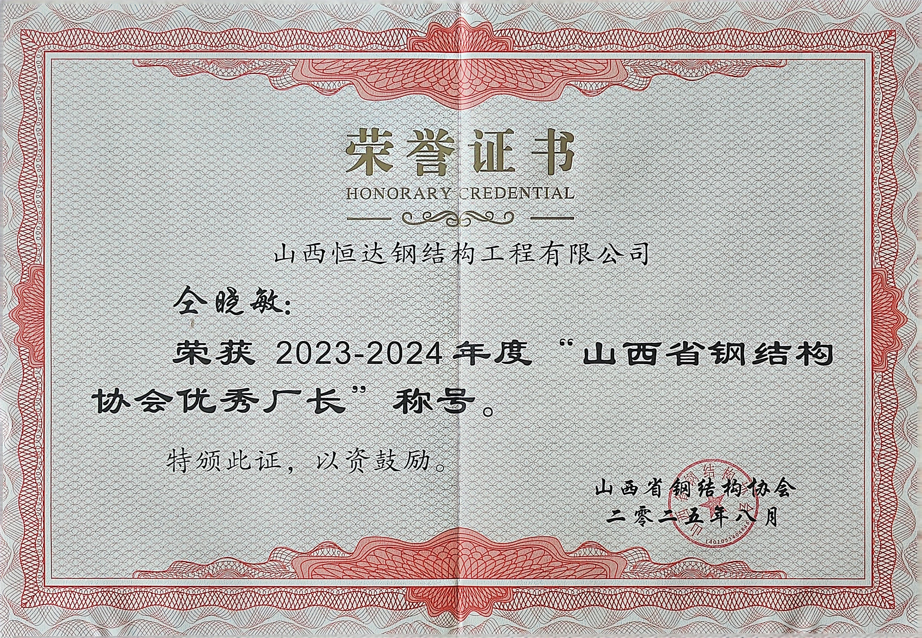 山西恒達鋼結(jié)構(gòu)仝曉敏獲得2023-2024年度山西省鋼結(jié)構(gòu)協(xié)會優(yōu)秀廠長